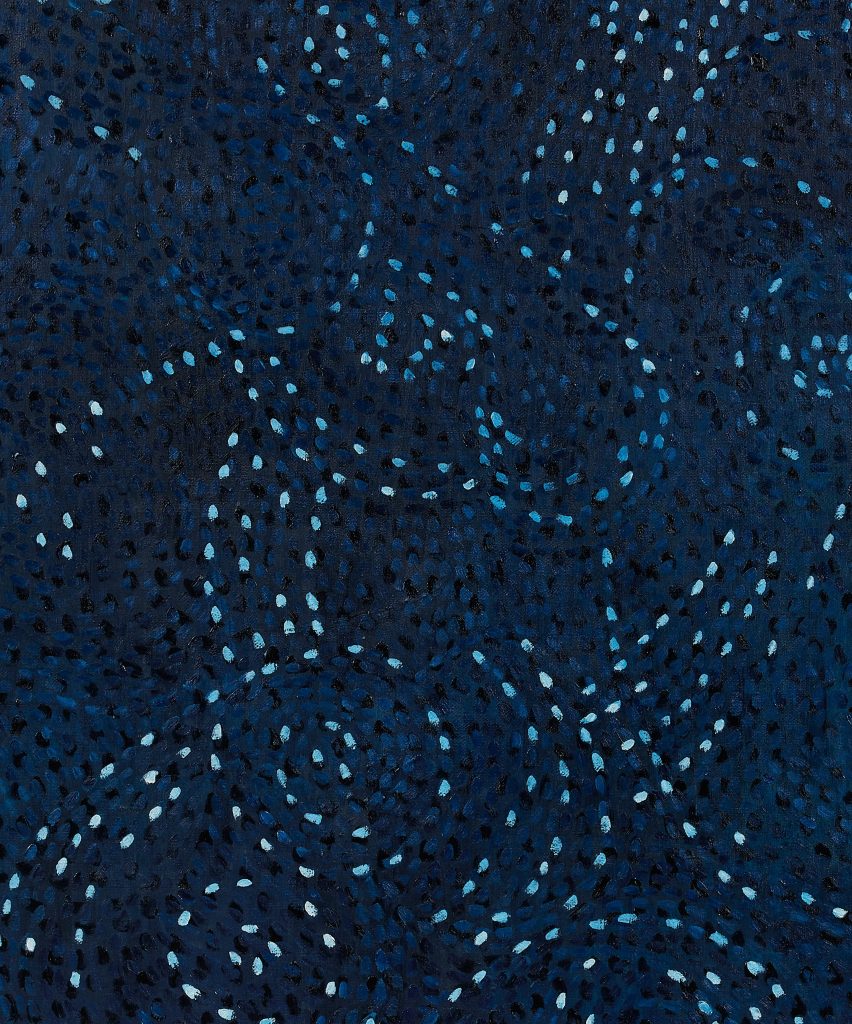 특히 이번 작업들 속에는 더욱 함축적인 선과 추상 형상들, 차분한 색으로써 작가의 느린 호흡과 발걸음, 그리고 이에 화답하는 자연의 숨을 더 많이 담아낸 것처럼 보인다. 자연 속을 걸으며 오랜 시간 멈춰 생각하는 과정들은 흘러가는 순간의 시간보다 사유의 깊이로 파고드는 초월적 시간, 우주적 공간을 떠올리게 한다. 작가의 시선은 하늘에 닿았다. 그는 종종 작품에서 푸른 색감으로 하늘을 암시적으로 비추어왔는데, 신작 <별을 모으는 사람>(2025)에서는 더욱 넓고 높게 하늘을 향해 마음을 연다. 하늘을 떠올린 작업들은<Night Sky>(2025), <Under the Sky>(2025)와 같은 작품으로도 찾아볼 수 있다. 작가는 일상의 어귀에서 우연히 올려다 본 별이 흐르는 밤 하늘에 영감을 받았다. 이 작품은 푸른 색감을 사랑하는 ‘색의 연금술사’인 그가 지금까지 사용한 블루 중 가장 깊은 밤의 색, 심연의 푸른색을 담고 있다. 진한 남색 톤의 밤하늘은 고경애 특유의 기법인 작은 붓을 여러 번 터치한 흔적들로 표상된다. 이는 유기체처럼 꿈틀대며 순환하는 우주의 신비와 무한함을 연상케 한다.