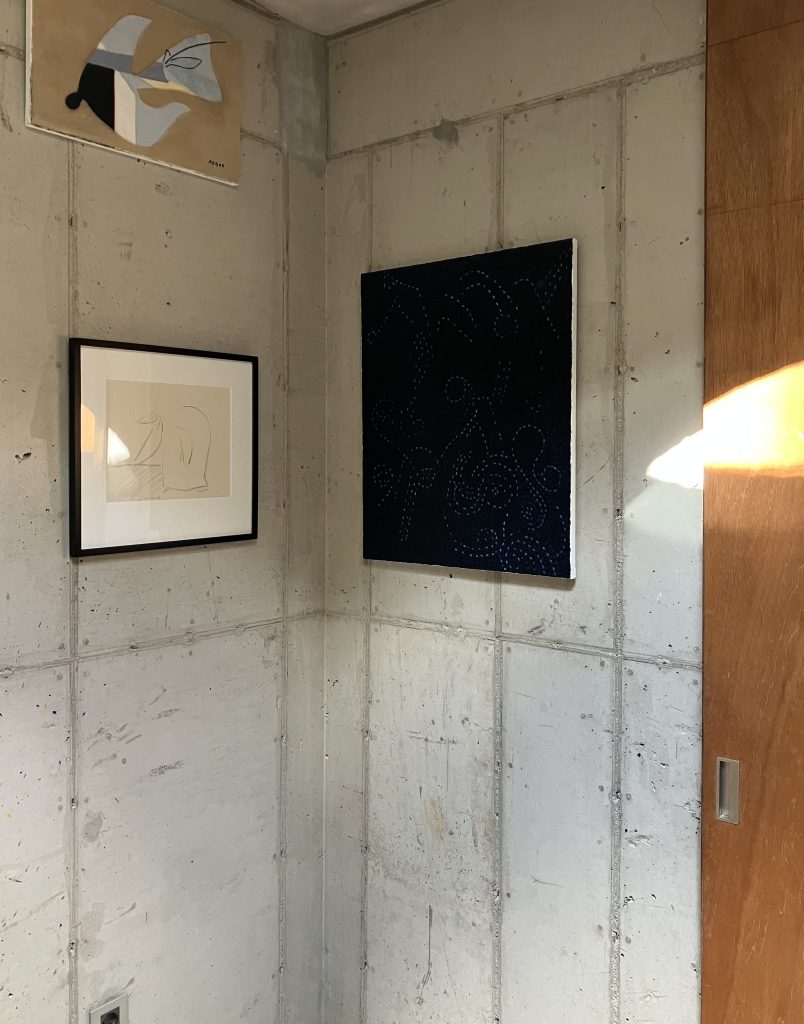 In these new works, simplified lines, abstract forms, and calm hues seem to embody the artist’s slower breath, her unhurried steps, and the responding rhythm of nature itself. As she walks through the natural world and pauses in reflection, time expands—not as fleeting moments, but as a transcendental, cosmic flow. Her vision turns skyward. Blue has long been her way of hinting at the heavens, yet in her new painting (2025), her heart opens wider and higher toward the sky.The celestial motif continues in (2025) and (2025). Inspired by a chance glance at stars drifting across the night, she explores the deepest blue she has ever used—a blue of abyss and infinity. The dark indigo-toned sky is rendered with countless small brush touches, creating a living, breathing pattern that evokes the organic pulse and cyclical mystery of the universe. Yet even amidst this transcendence, the artist never lets go of warmth—of the human presence. The “gatherer of stars” can be inferred from faint strokes of pale blue blended with the stars themselves. This figure, rather than gazing at or chasing stars, collects them, evoking her earlier work (2022), where bowed farmers reaped rice in humble harmony with the earth. Here too, the gatherer is neither a dreamer lost in cosmic reverie nor one who escapes reality, but a grounded soul who anchors dream and labor in the same soil. In this shared color and form, where stars and humankind touch beyond boundaries, AeGoh finds the essence of time transcended.